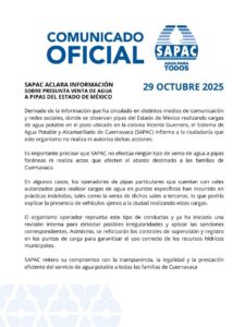 Es importante precisar que SAPAC no efectúa ningún tipo de venta de agua a pipas foráneas ni realiza actos que afecten el abasto destinado a las familias de Cuernavaca.