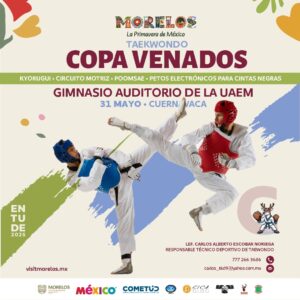 El Gobierno de Morelos, anunció la realización de la 16ª edición de la Copa Venados de Taekwondo, que se llevará a cabo del 30 de mayo al 01 de junio en las instalaciones del Polideportivo de la Universidad Autónoma del Estado de Morelos (UAEM), con la participación de más de mil 500 atletas provenientes de Guerrero, Puebla, Ciudad de México, Estado de México, Querétaro, Michoacán y Morelos.