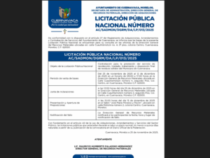El Ayuntamiento de Cuernavaca lanzó este martes 25 de noviembre de 2025 la Licitación Pública Nacional AC/SADMON/DGRM/DA/LP/013/2025 para contratar, por los próximos años, el servicio de recolección, traslado, tratamiento y disposición final de los residuos sólidos del municipio.