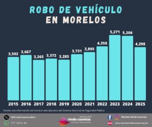 En 2025, Morelos registró una notable reducción en los casos de robo de vehículos, con una disminución del 17% en comparación con el año anterior.