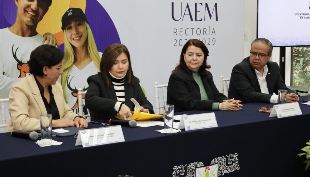 En conferencia de prensa y con la presencia de titulares de diversas unidades académicas y administrativas de la UAEM, la rectora Viridiana Aydeé León Hernández encabezó la reunión donde destacó el compromiso de la institución con la inclusión y la ampliación de la cobertura educativa.