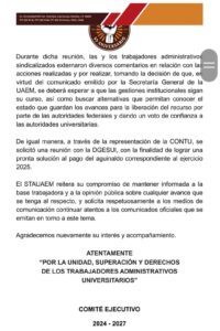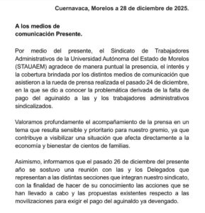 El Sindicato de Trabajadores Administrativos de la Universidad Autónoma del Estado de Morelos (STAUAEM) anunció la suspensión de las movilizaciones previstas para el lunes 29 de diciembre.